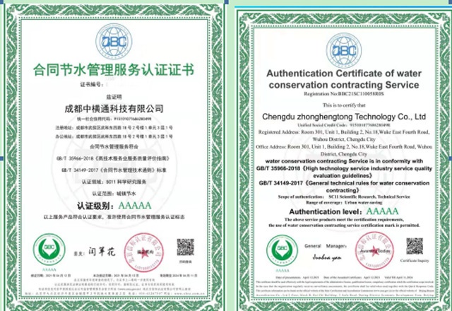 经审查复核、认证评定、批准注册,2021年4月12日,成都中横通科技有限公司成功获得《合同节水管理服务认证证书》!